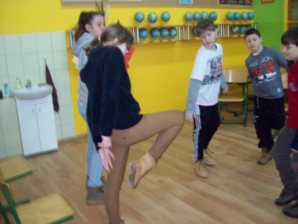 - opukiwanie ciała od stóp do głów /stoimy i złożonymi pięściami opukujemy nogi, ręce, barki w kierunku serca – prawa ręka lewą stronę, a lewa prawą; na końcu opukujemy górną część pleców i leciutko – palcami dłoni głowę