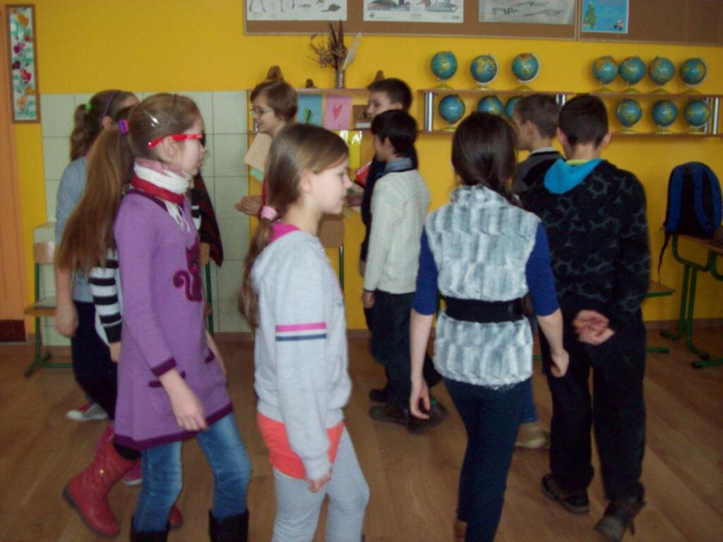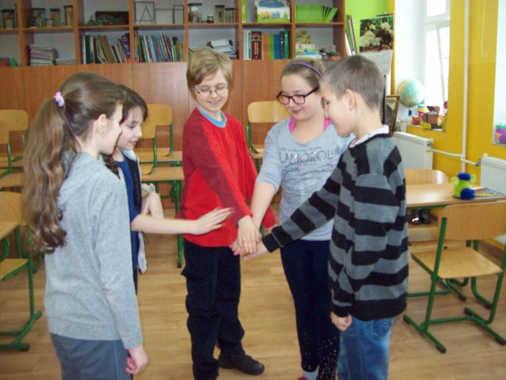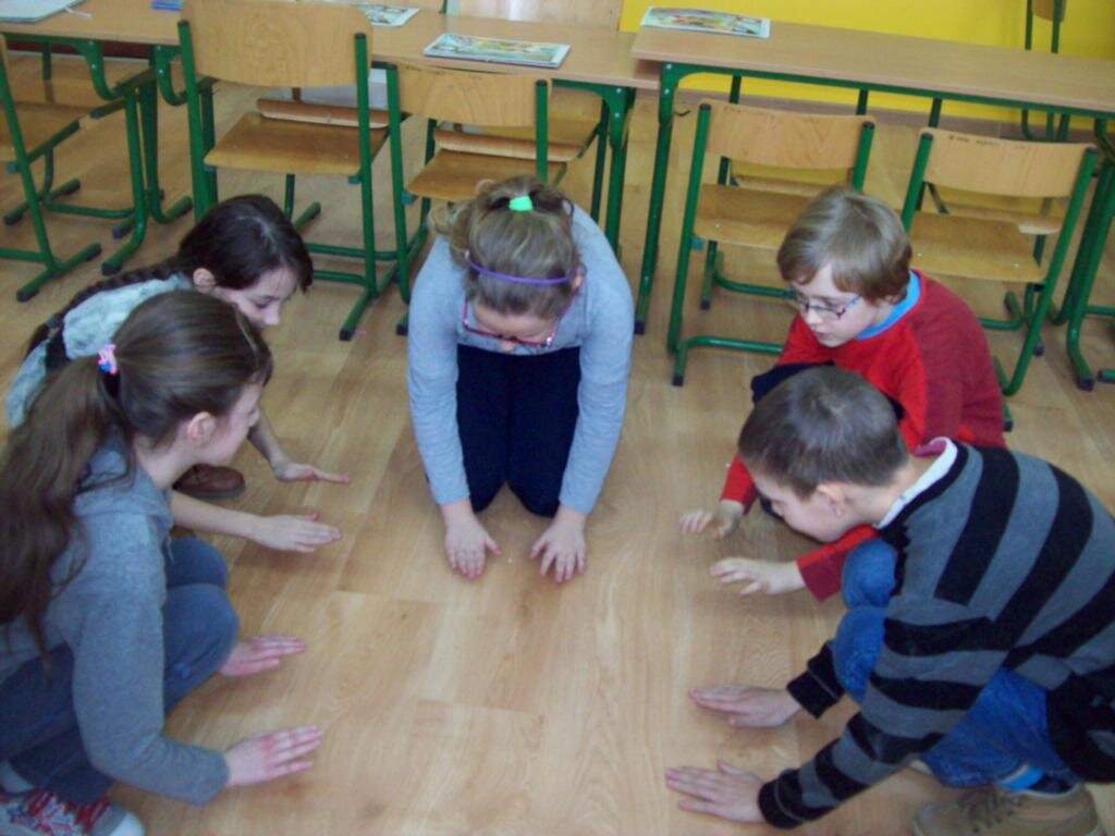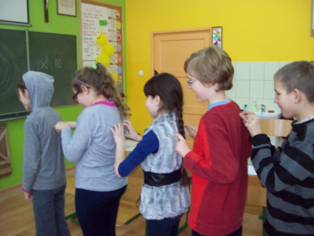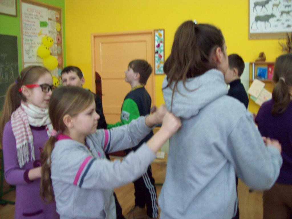 - masaż pleców w kręgu ustawiamy się w kręgu i opukujmy plecy osoby stojącej przed nami, potem się odwracamy – kolejność opukiwania: „najpierw szły słonie” pięści, „potem szły konie” kostki, „potem panie w szpileczkach” palce, potem mróweczki łaskoczemy, „potem deszczyk – przeszedł Cię dreszczyk?’’lekkie uderzenie pleców palcami; kończymy mocnym przesunięciem dłoni zwiniętej w pięść po kręgosłupie w dół.