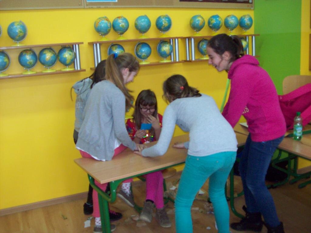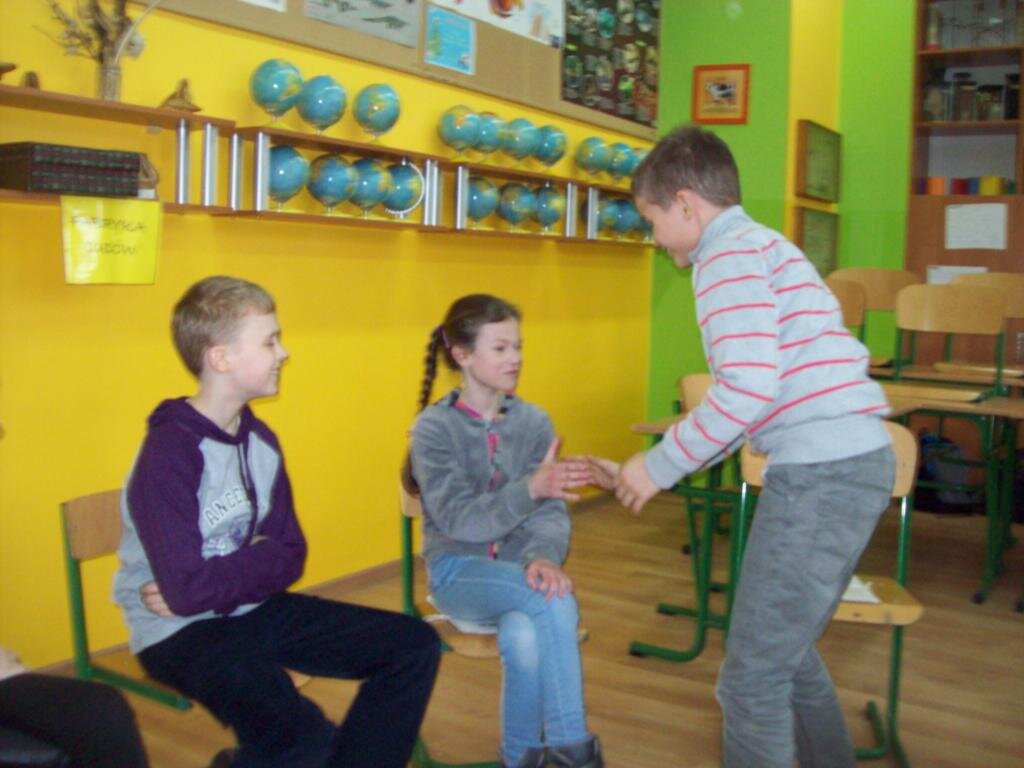 Uczniowie podczas zajęć wcielili się w rolę tzw. przeszkadzaczy czyli hałasu, bałaganu, dzwonka telefonu, telewizora, zwierzęcia, siostry czy brata. Wybrani uczniowie próbowali znaleźć sposób na te stwory i mimo zamętu zapamiętać jak najwięcej zadanych do nauczenia słów. Nie było łatwo – na 9 słów zapamiętali 5-6. Musieliśmy więc wymyśleć swoje sposoby na przeszkadzacze np. wyproszenie intruza z pokoju, prośba o wyłączenie telewizora, ściszenie muzyki, a nawet krzyknięcie, wypchnięcie itp.