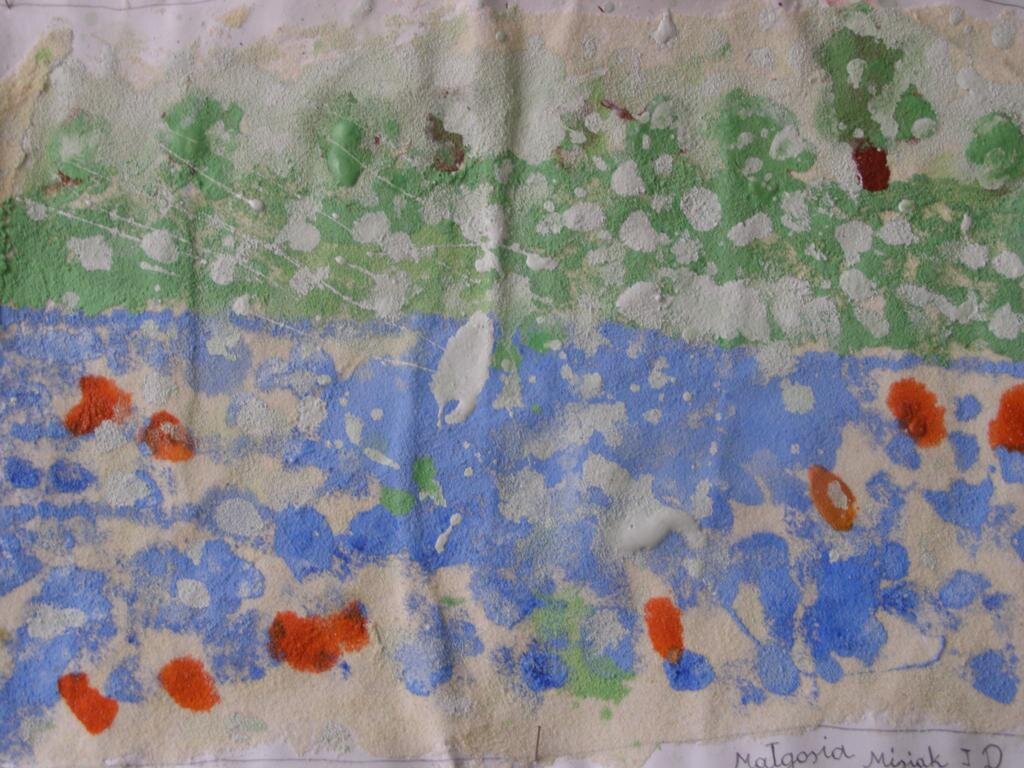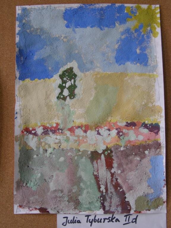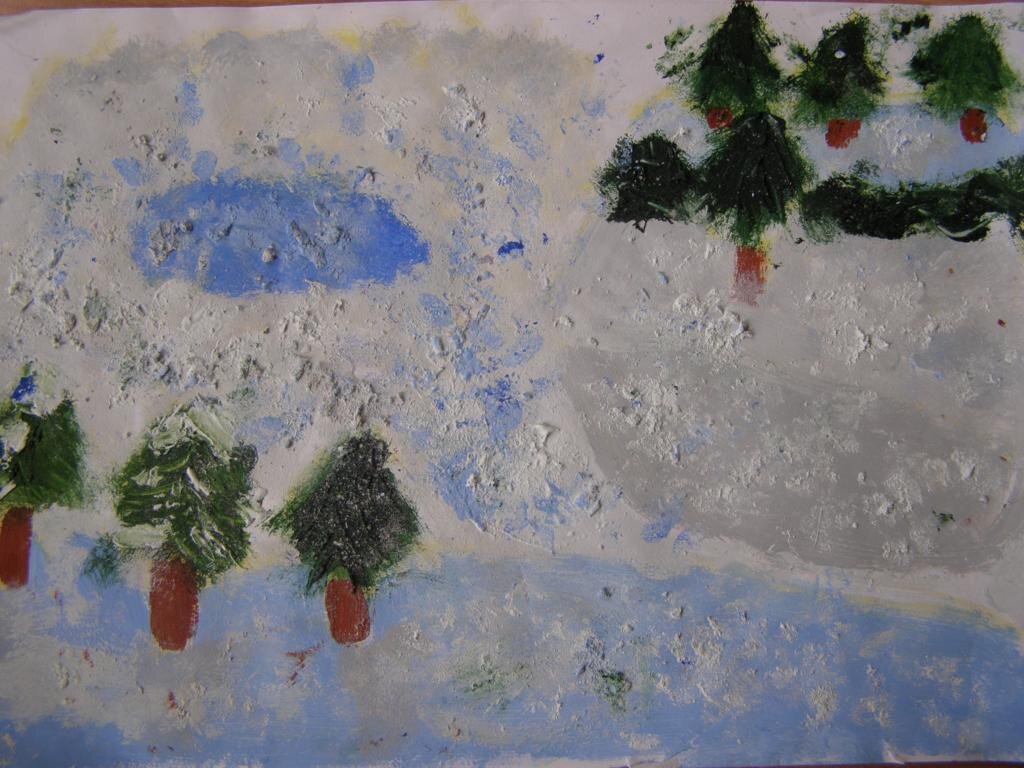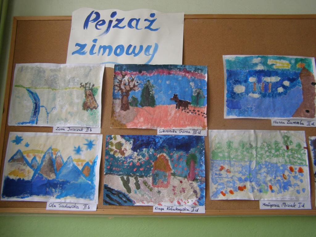 Zapraszamy do galerii pejzażu zimowego. Prace plastyczne wykonali uczestnicy Koła Plastycznego. Technika plastyczna z użyciem kaszy i mąki pozwoliła uzyskać ciekawą fakturę na powierzchni dzieł młodych artystów.