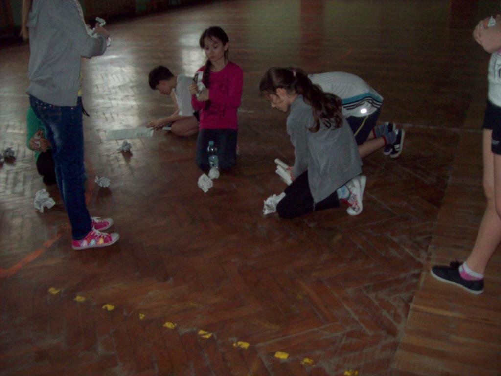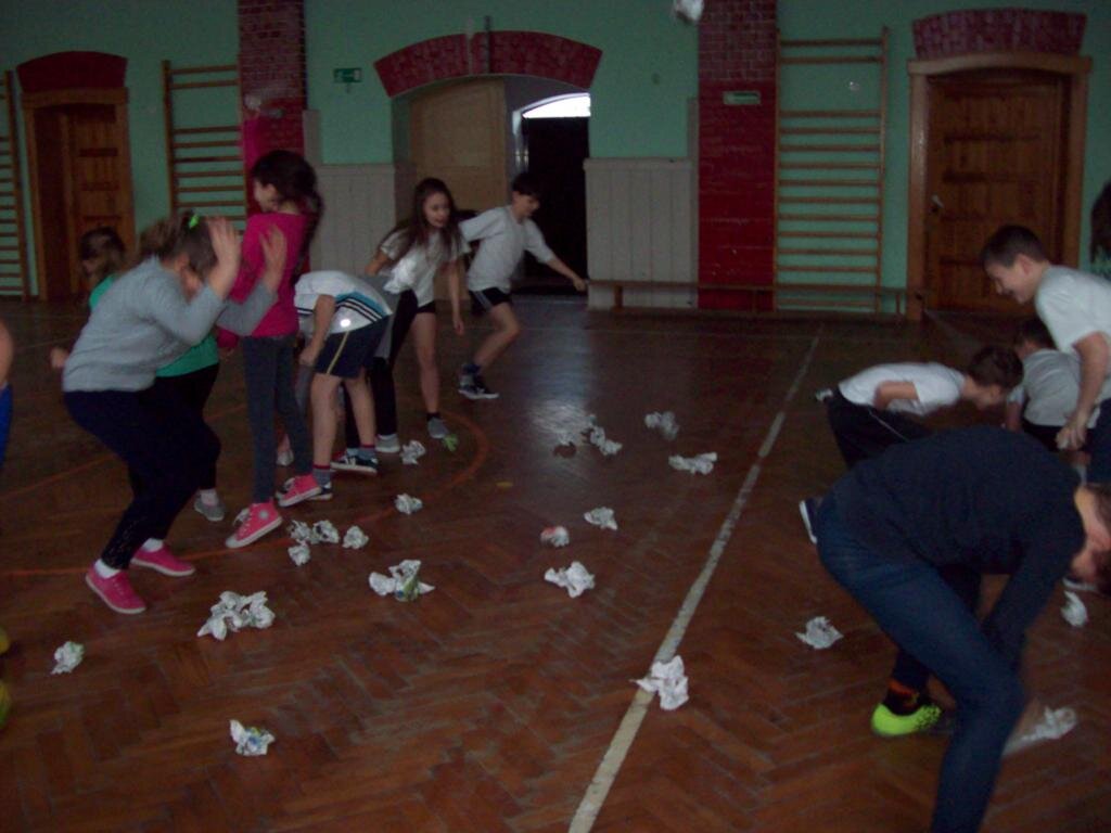 Spróbowaliśmy zarządzać naszą energią udając, że biegamy radośnie po łące, podbijamy piłkę, idziemy bardzo wolno z ciężkim plecakiem i bawiąc się w „pajacyki”. Pompowaliśmy dłońmi, przeciągaliśmy się jak lwy głośno rycząc, wirowaliśmy barkami. Bawiliśmy się w „grzanki” i „pralkę automatyczną”. Dzięki temu poznaliśmy główną zasadę „ładowania energii”, którą jest ENERGICZNY, SZYBKI RUCH.