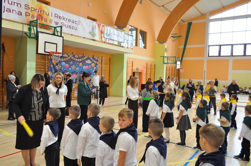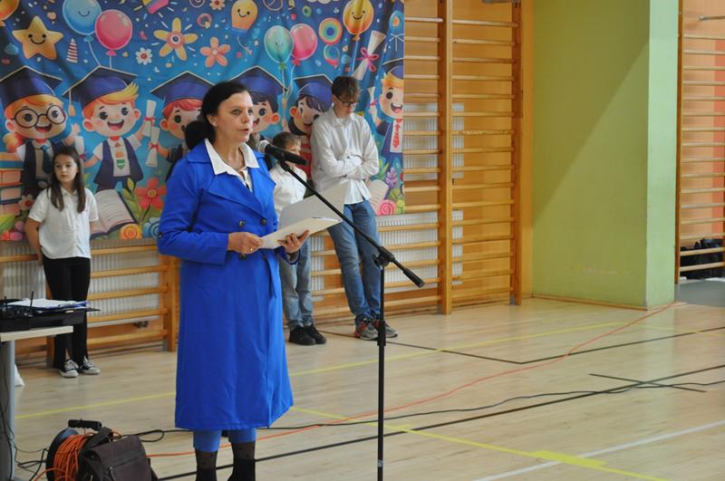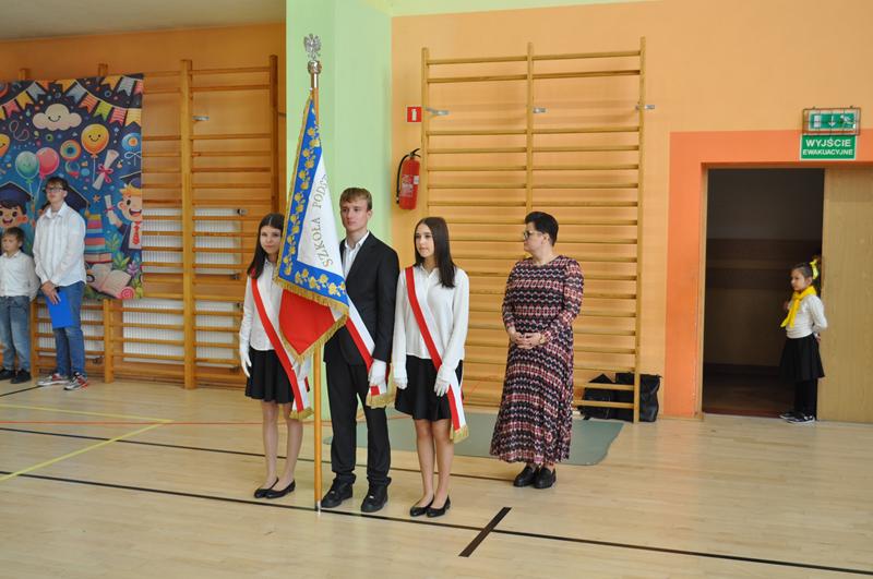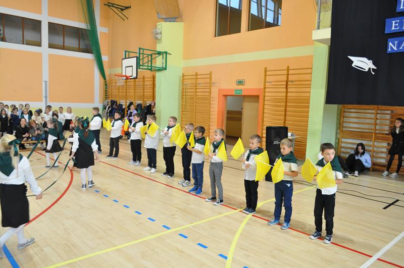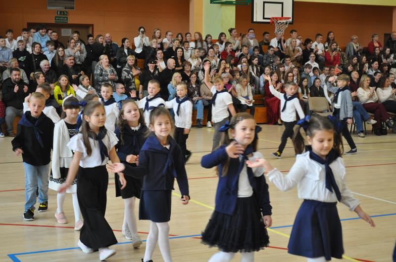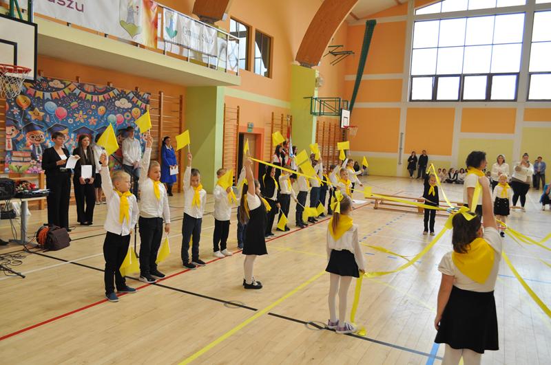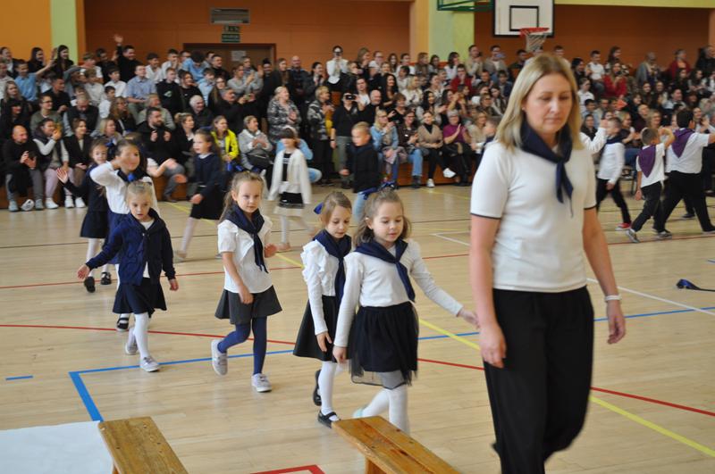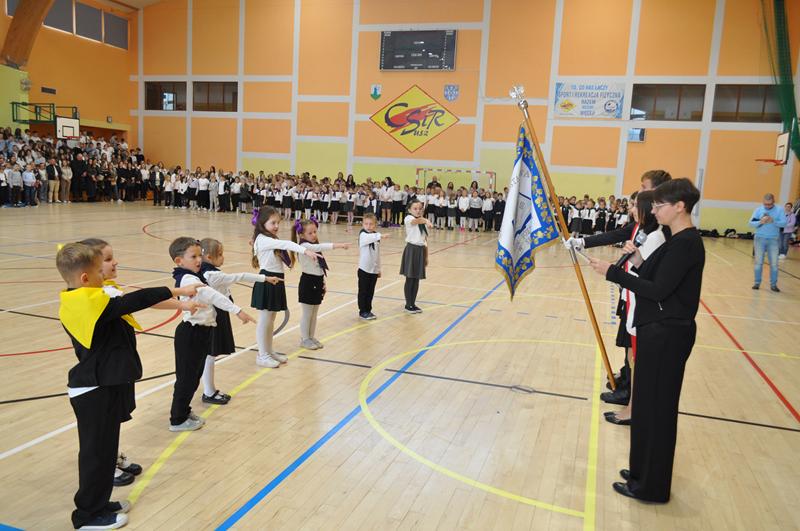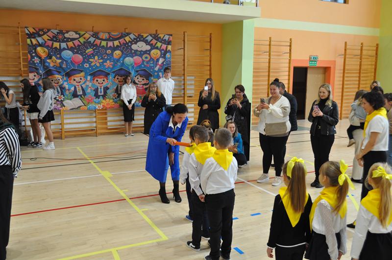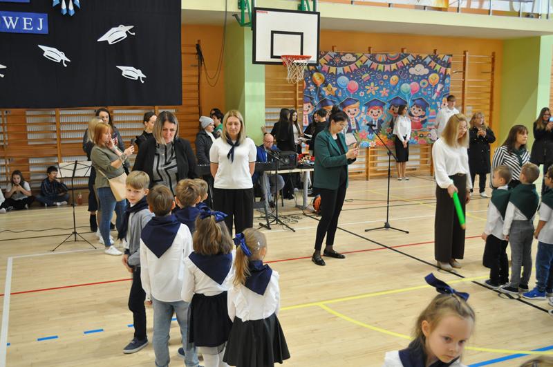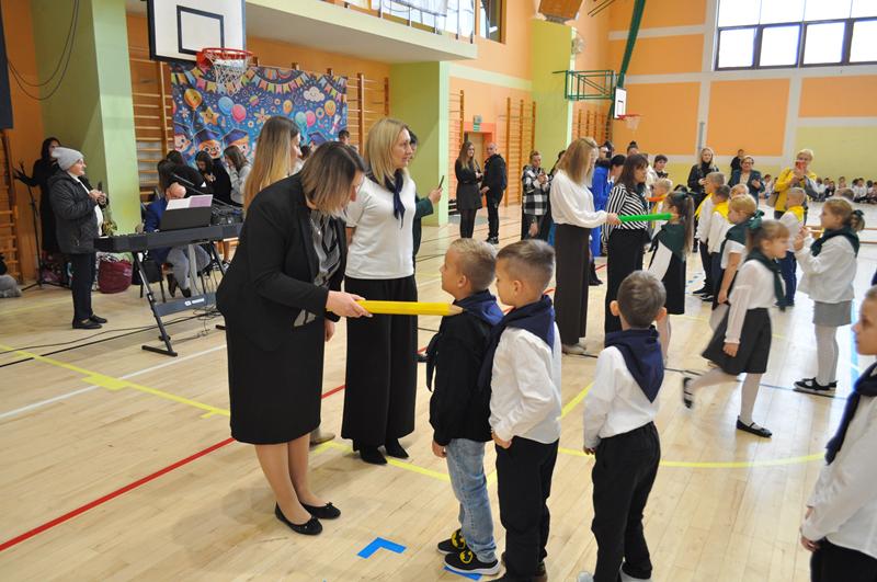 Jednym z najpiękniejszych momentów uroczystości był taniec ze wstążkami i chorągiewkami, który zachwycił wszystkich zgromadzonych. Kolorowe wstążki, muzyka i radosne uśmiechy dzieci stworzyły niezapomniany widok. Po części artystycznej nastąpiło uroczyste ślubowanie i pasowanie na ucznia, którego dokonała Pani dyrektor. Od tej chwili pierwszoklasiści stali się pełnoprawnymi członkami szkolnej społeczności. Uroczystość została przygotowana przez wychowawczynie klas pierwszych, które z wielkim zaangażowaniem zadbały o każdy szczegół wydarzenia.