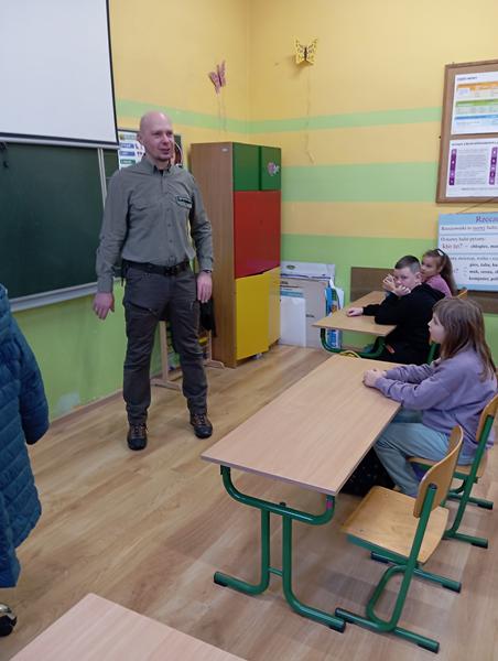Utrwalili zasady zachowania się w lesie i postępowania z dzikim zwierzęciem. Dzieci dowiedziały się, dlaczego jeleń lub łoś mają poroże a nie rogi. Pan Jarosław opowiedział o swojej pracy. Dzieci z dużym zainteresowaniem słuchały informacji przekazywanych przez pracownika lasu. Na koniec spotkania odbył się konkurs podsumowujący zdobytą wiedzę. Spotkanie upłynęło w miłej atmosferze a wysłuchane ciekawostki i wiadomości poszerzyły wiedzę przyrodniczą dzieci.