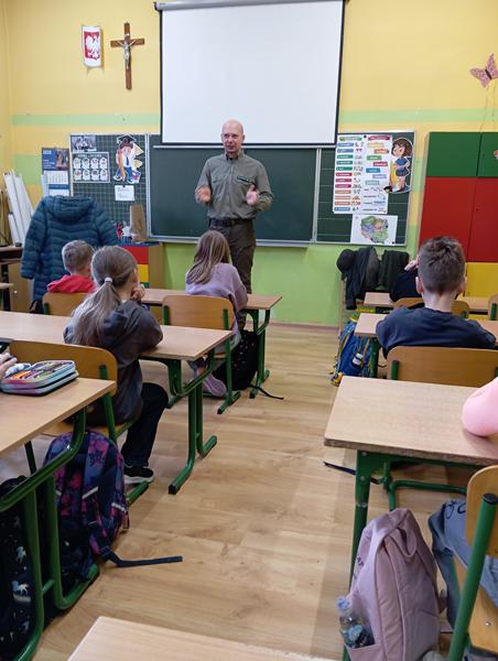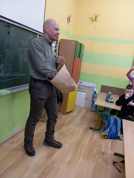 22 października 2025r. uczniowie kl. III b uczestniczyli w niezwykłej lekcji przyrody. Pan leśniczy Jarosław Trocki z nadleśnictwa Mortąg w ciekawy sposób opowiedział uczniom o lesie i jego mieszkańcach oraz pracy leśnika. Uczniowie poszerzyli swoją wiedzę na temat warstwowej budowy lasu, nazw drzew, krzewinek i roślin zielnych oraz zwierząt.