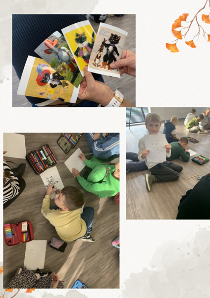 W trakcie spotkania pani Irena zorganizowała również aktywność dla najmłodszych. Dzieci miały możliwość uczestniczenia w kąciku małego artysty, gdzie rysowały krok po kroku, pod czujnym okiem malarki bajkową postać Kota w butach. To było cudowne doświadczenie. Powstały piękne prace. Wychowawcy otrzymali pamiątkowe kartki namalowane przez panią Barbarę.
