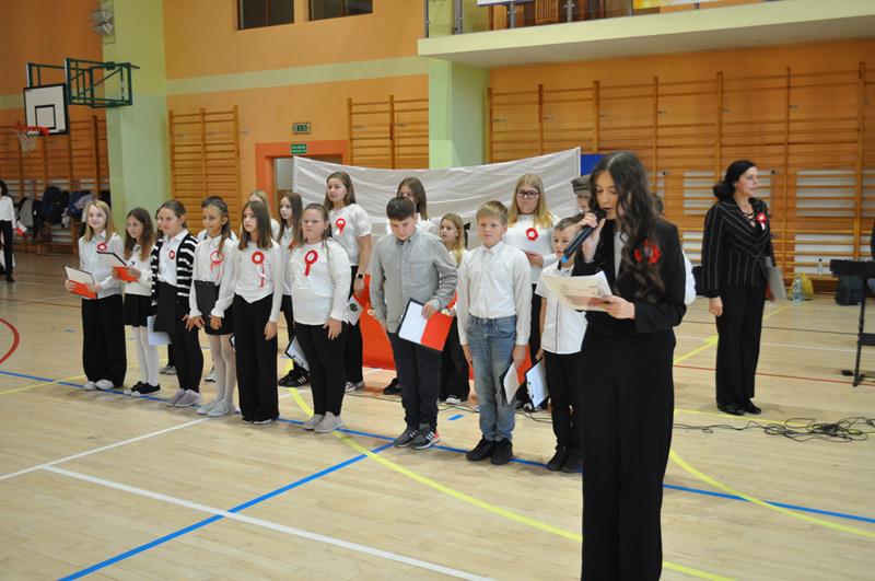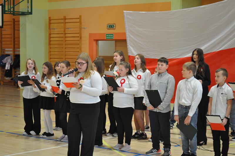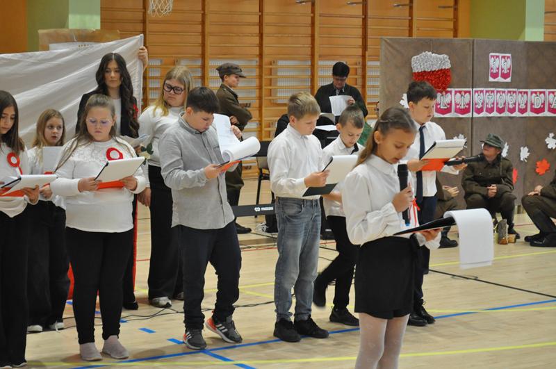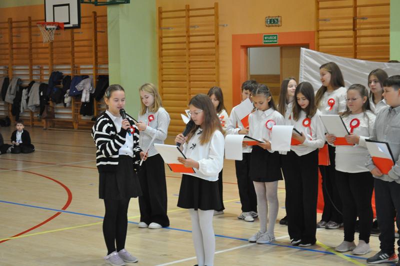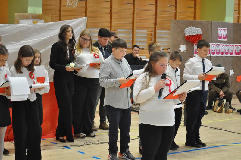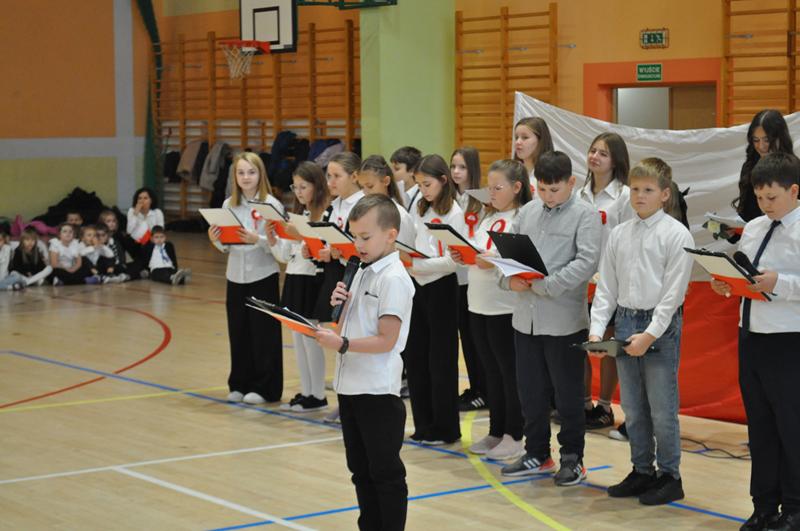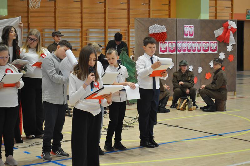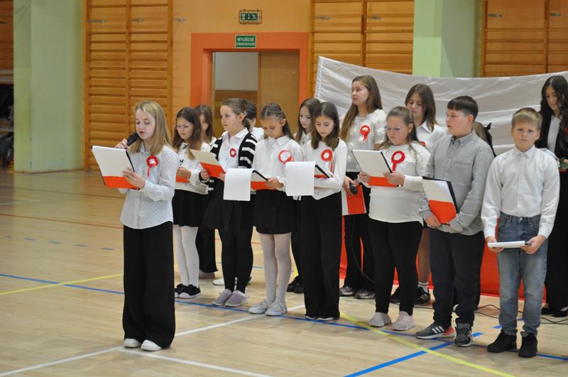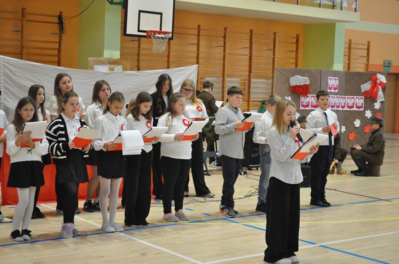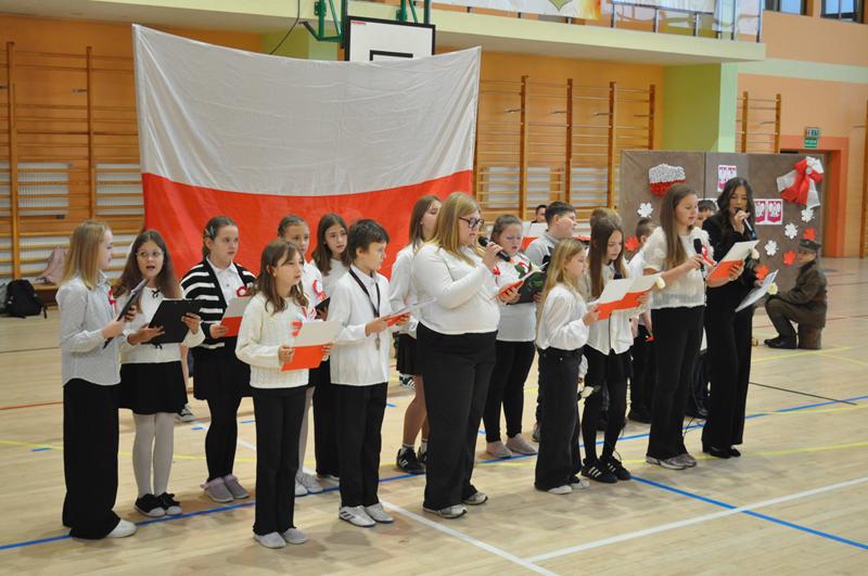 Uczniowie zaprezentowali krótki montaż słowno-muzyczny ukazujący drogę Polski do odzyskania niepodległości w 1918 roku. Występ wzbogaciły piosenki patriotyczne, tworząc podniosłą atmosferę i przypominając o bohaterach walczących o wolność ojczyzny.
