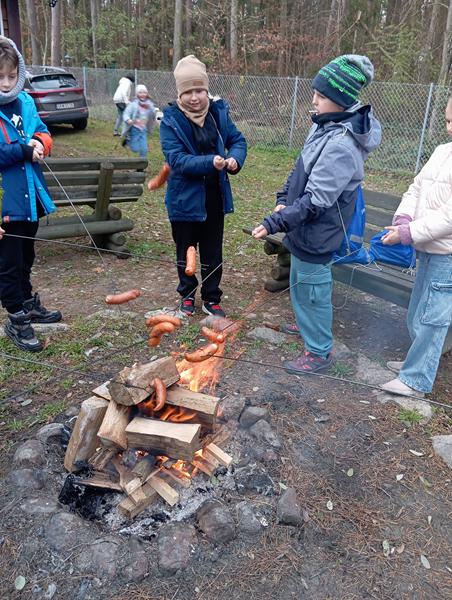 Na zakończenie spotkania klasa otrzymała pamiątkowy dyplom. Wielką radość sprawiło samodzielne pieczenie kiełbasek, które dzieci zjadły ze smakiem.