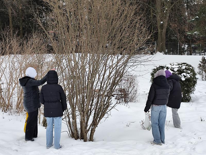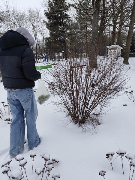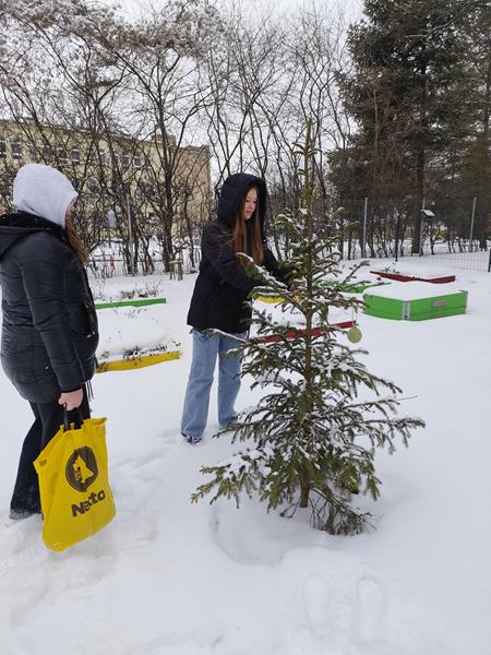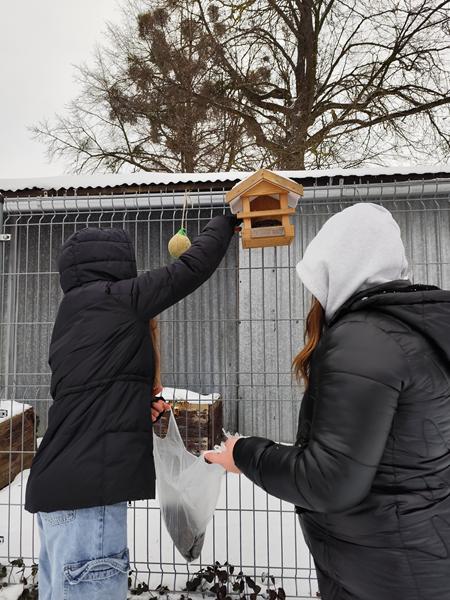 Zimowa pomoc dla zwierząt w naszej szkole trwa nadal. Wolontariuszki zawiesiły na drzewkach i krzewach wokół szkoły karmę dla ptaków i rozsypały ziarenka słonecznika. Smacznego ptaszki
