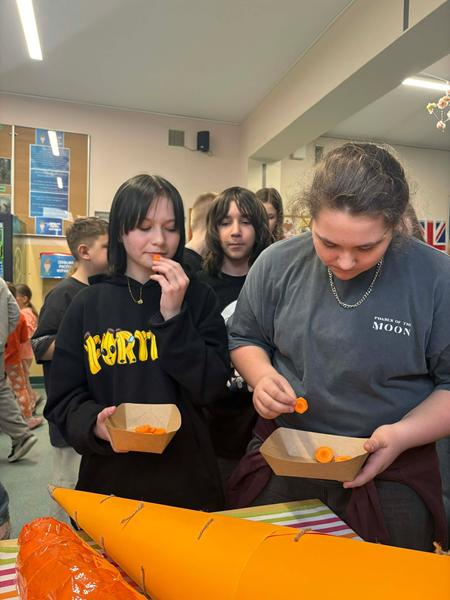 20 marca w naszej szkole odbył się pełen uśmiechu i dobrej zabawy Dzień Marchewki. Już od rana na korytarzach zrobiło się wyjątkowo pomarańczowo – wielu uczniów założyło ubrania w tym kolorze, wprowadzając radosny, wiosenny klimat (a przy okazji zostali oni mile zaskoczeni słodkim upominkiem.