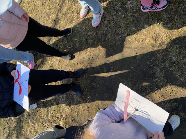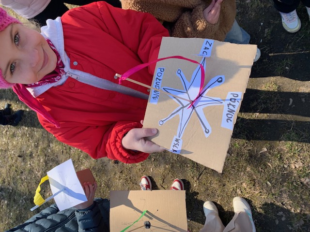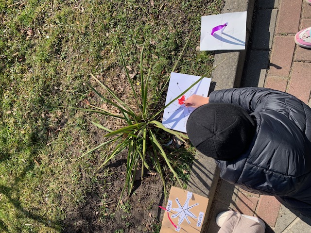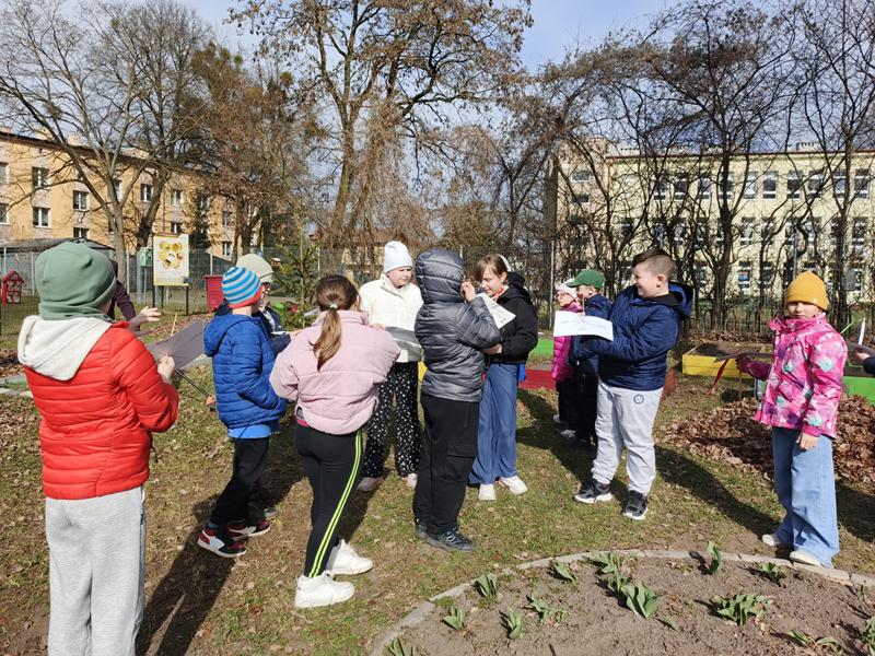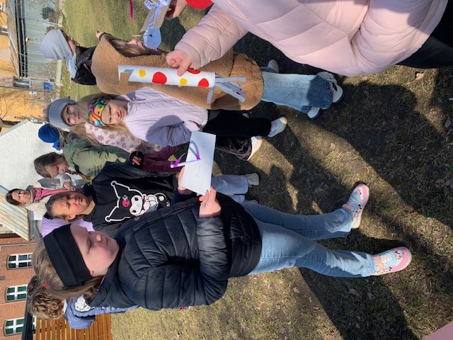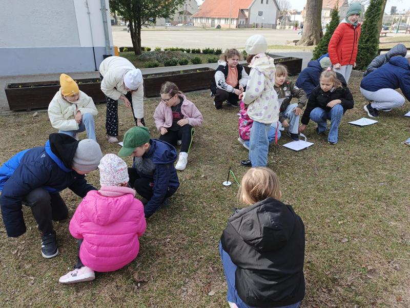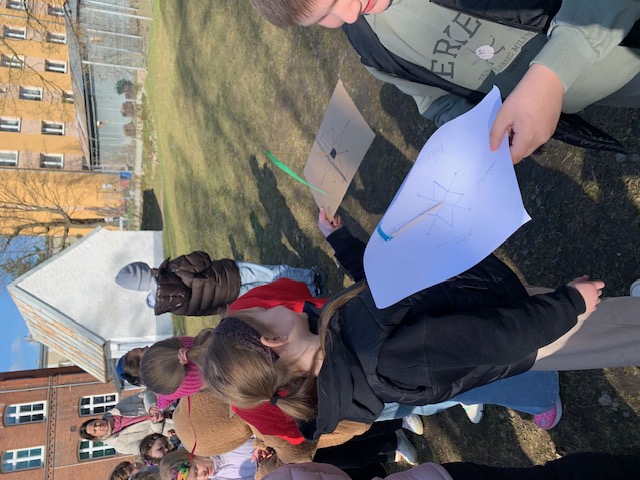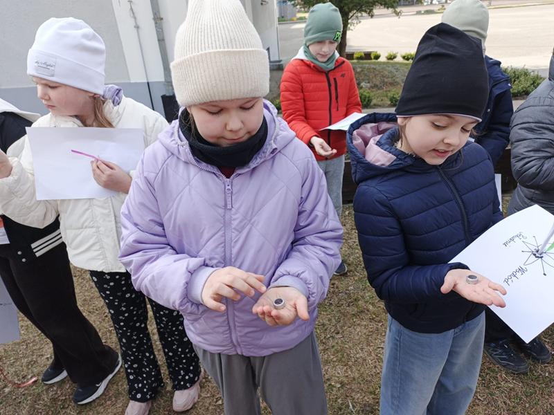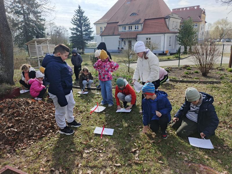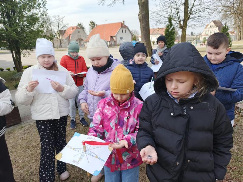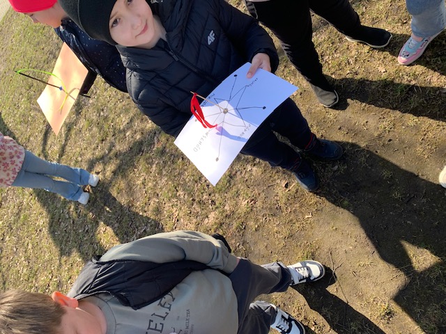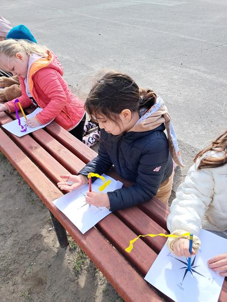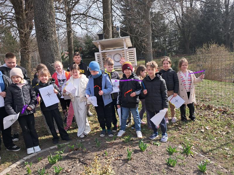 Dzieci uczyły się również korzystania z kompasu – poznawały jego budowę i zasady działania, a następnie wykorzystywały go do wyznaczania kierunku północnego. Ćwiczenia te pozwoliły im lepiej zrozumieć orientację w terenie oraz znaczenie kierunków świata w codziennym życiu. Zajęcia odbyły się w ogrodzie, gdzie uczniowie mieli możliwość obserwowania stacji badawczej wyposażonej w podstawowe przyrządy meteorologiczne, takie jak termometr, barometr oraz wiatromierz. Nauczyli się, do czego służą te urządzenia oraz jakie informacje można dzięki nim uzyskać. Dzięki tym działaniom uczniowie poznali na czym polega praca meteorologa – dowiedzieli się, jak prowadzi się obserwacje pogodowe, jakie pomiary są wykonywane oraz dlaczego są one ważne. Zajęcia miały charakter praktyczny i angażujący, co sprzyjało rozwijaniu ciekawości poznawczej oraz zainteresowania światem przyrody.