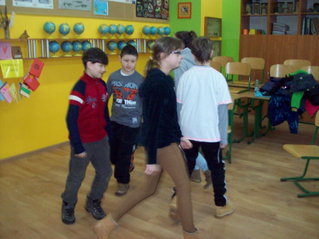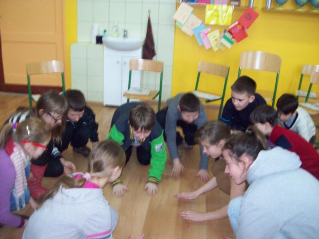 - masaż pleców w kręgu ustawiamy się w kręgu i opukujmy plecy osoby stojącej przed nami, potem się odwracamy – kolejność opukiwania: „najpierw szły słonie” pięści, „potem szły konie” kostki, „potem panie w szpileczkach” palce, potem mróweczki łaskoczemy, „potem deszczyk – przeszedł Cię dreszczyk?’’lekkie uderzenie pleców palcami; kończymy mocnym przesunięciem dłoni zwiniętej w pięść po kręgosłupie w dół.