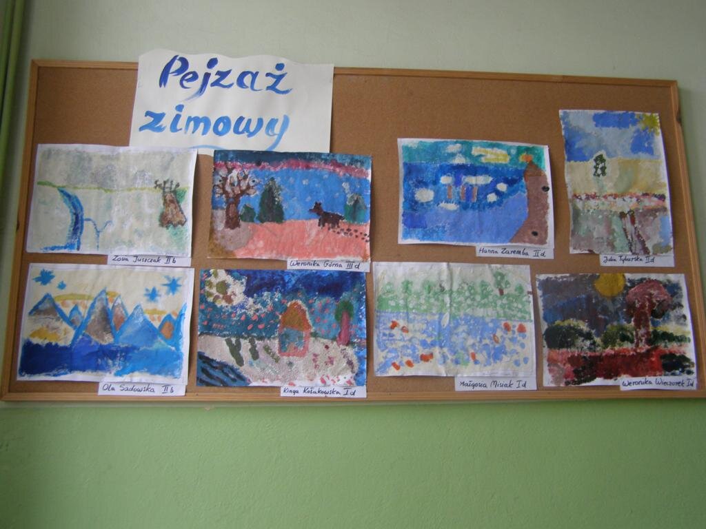 Zapraszamy do galerii pejzażu zimowego. Prace plastyczne wykonali uczestnicy Koła Plastycznego. Technika plastyczna z użyciem kaszy i mąki pozwoliła uzyskać ciekawą fakturę na powierzchni dzieł młodych artystów.
