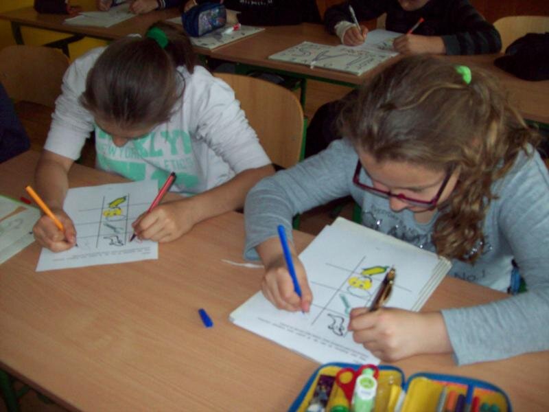 Zaczęliśmy od rozgrzewki, która polegała na rysowaniu oburącz, a następnie uczestniczyliśmy w Smoczym Quizie odpowiadając na przeróżne pytania. W nagrodę za prawidłowe odpowiedzi otrzymaliśmy wizerunki smoka, które zostaną umieszczone na naszych herbach.