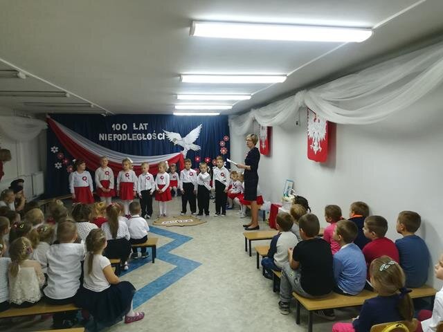 Dzieci przedszkole prezentowały nam wiersze i pieśni patriotyczne, a także zachwycające układy taneczne. Całej uroczystości uroku dodawał przepiękny wystrój sali oraz stroje młodych wykonawców. Gratulujemy Paniom oraz grupie Biedronki wspaniałej uroczystości i dziękujemy za zaproszenie.