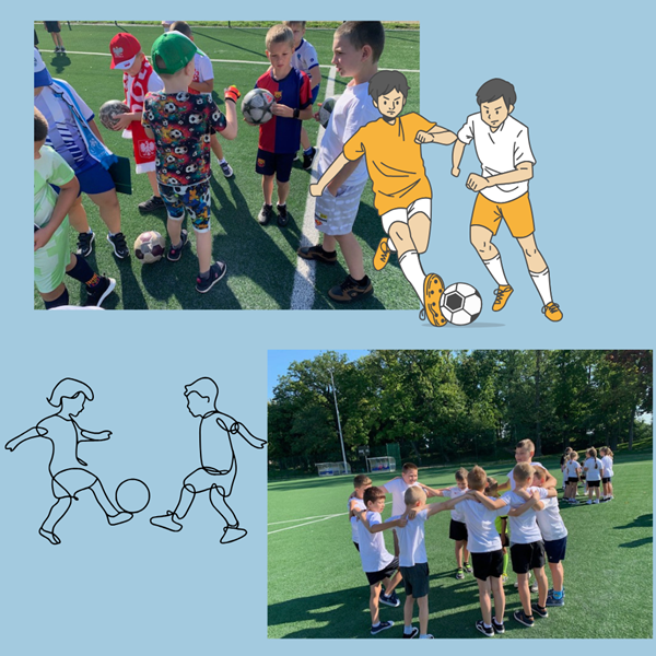 Po omówieniu zasad bezpieczeństwa i fair play przyszedł czas na rozgrzewkę. W małych drużynach trenowaliśmy podania oraz obronę. Strzały do bramki ćwiczyliśmy z wielkimi emocjami. Po każdym celnym uderzeniu były gromkie owacje. Nie zabrakło strefy kibica, która okrzykami motywowała do gry. W czasie meczu towarzyskiego wszyscy byli bardzo zaangażowani. Nie zwracaliśmy tego dnia uwagi na wynik, ważne że doskonale się bawiliśmy, choć mała iskierka zdrowej rywalizacji się pokazywała. W słonecznej atmosferze zrobiliśmy sobie pamiątkowe zdjęcia. W szkolnych ławkach pokazywaliśmy przyniesione gadżety sportowe, nie zabrakło wśród nich szalików, strojów sportowych czy książek o wybitnych piłkarzach. Rozmawialiśmy o zawodzie piłkarza i trenera. Dzień przebiegł w piłkarskiej atmosferze przy rytmach muzyki.
