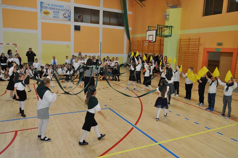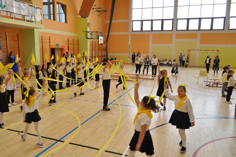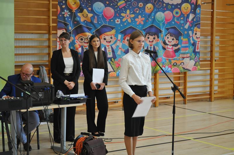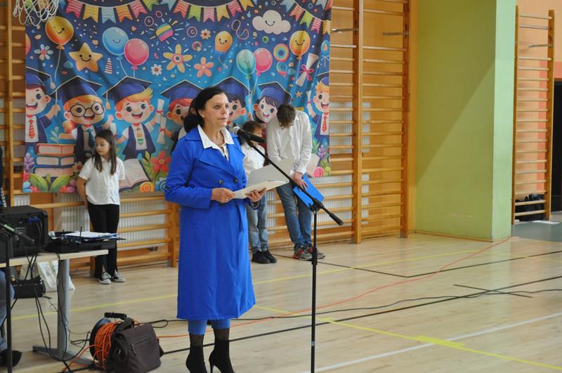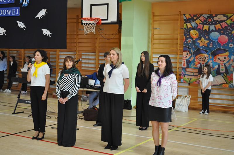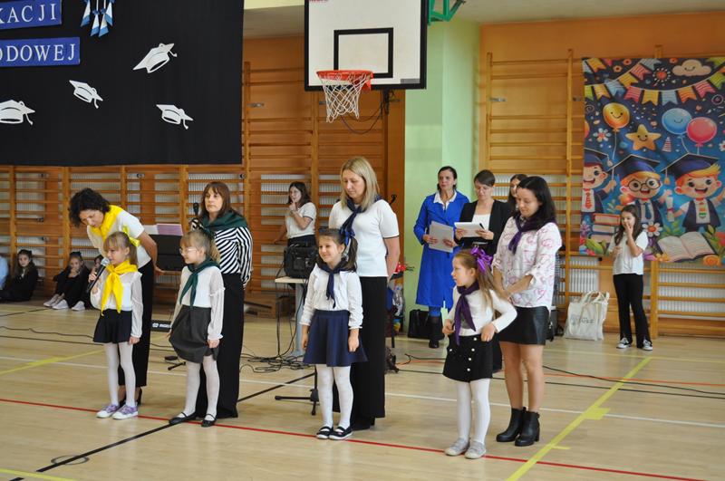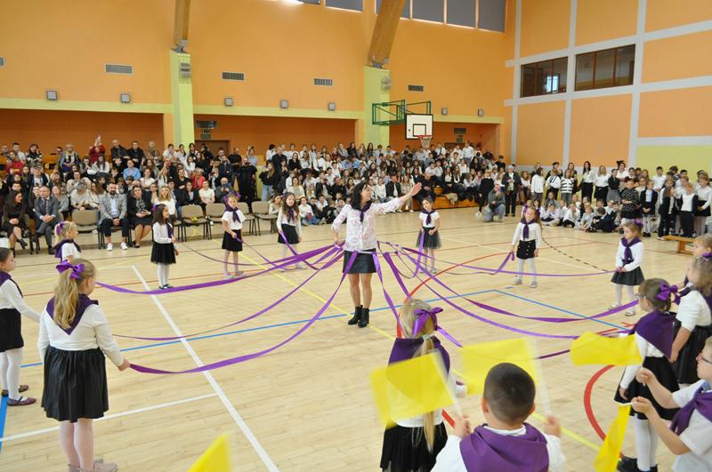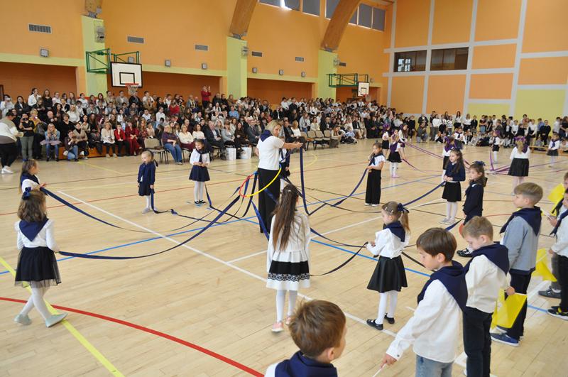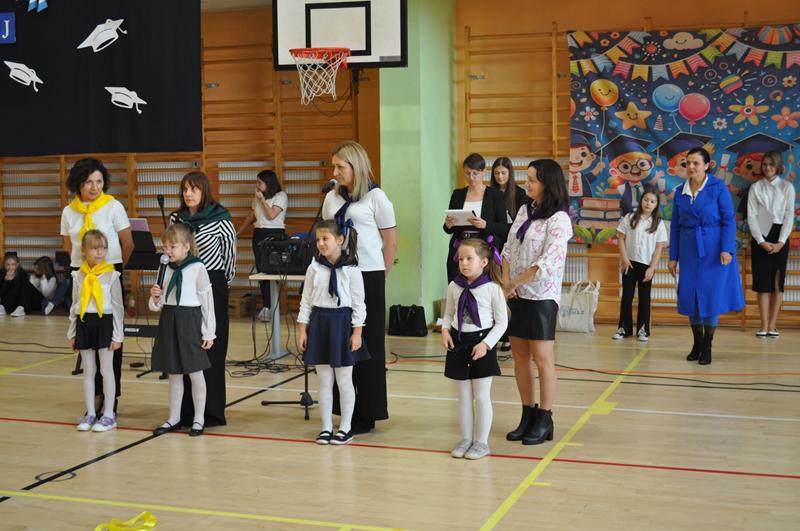 Jednym z najpiękniejszych momentów uroczystości był taniec ze wstążkami i chorągiewkami, który zachwycił wszystkich zgromadzonych. Kolorowe wstążki, muzyka i radosne uśmiechy dzieci stworzyły niezapomniany widok. Po części artystycznej nastąpiło uroczyste ślubowanie i pasowanie na ucznia, którego dokonała Pani dyrektor. Od tej chwili pierwszoklasiści stali się pełnoprawnymi członkami szkolnej społeczności. Uroczystość została przygotowana przez wychowawczynie klas pierwszych, które z wielkim zaangażowaniem zadbały o każdy szczegół wydarzenia.