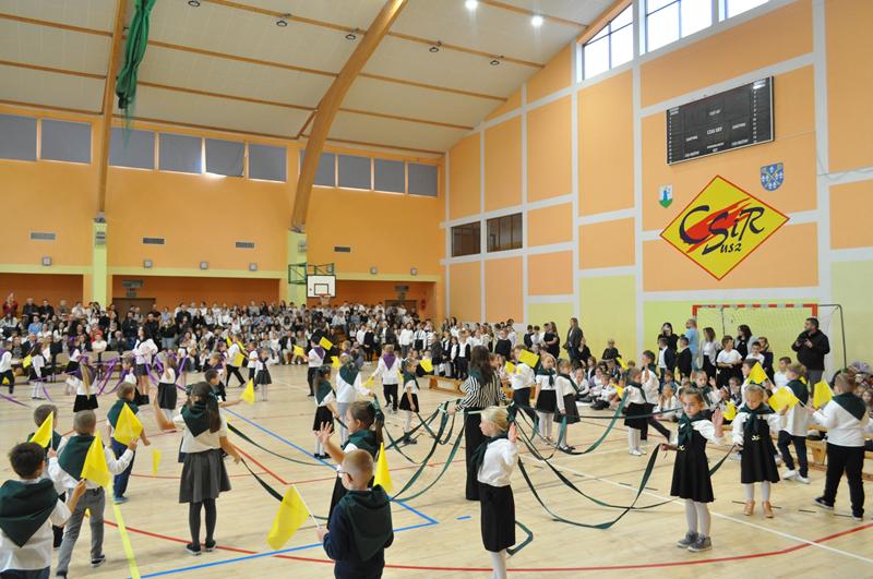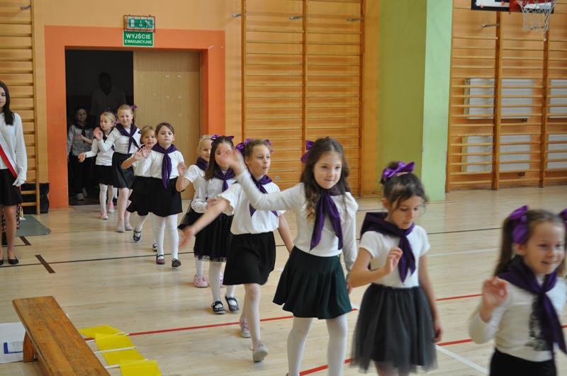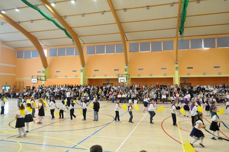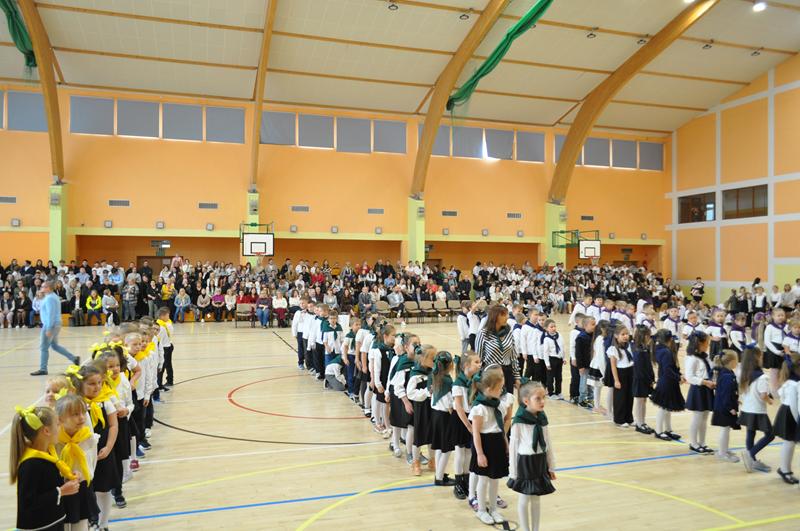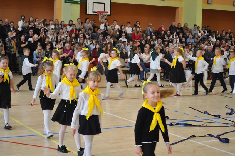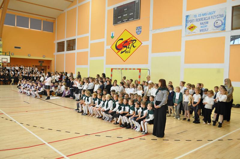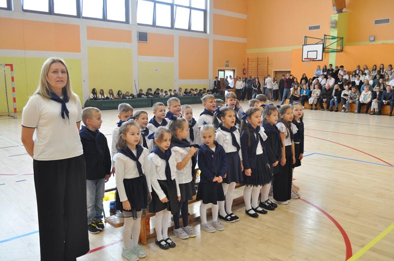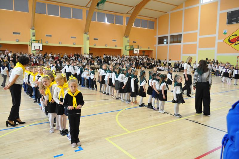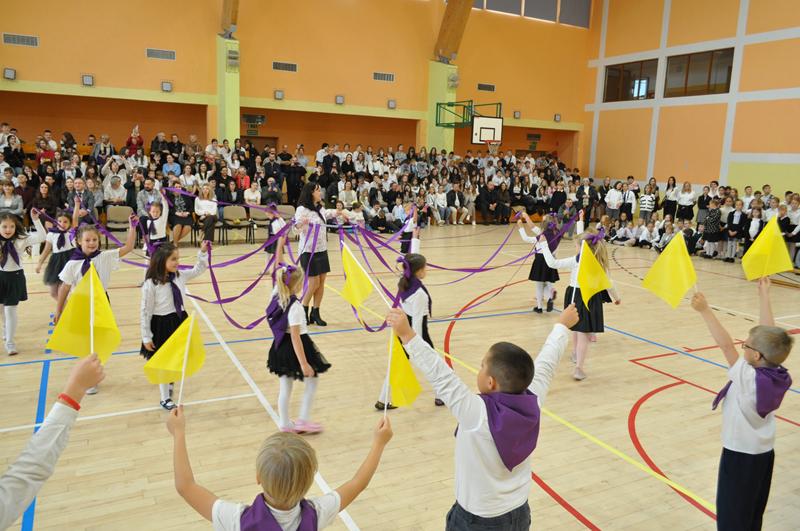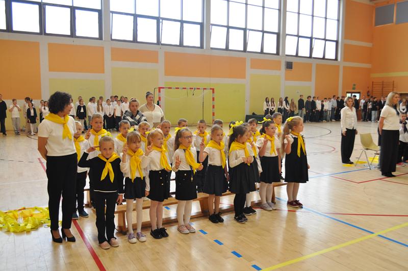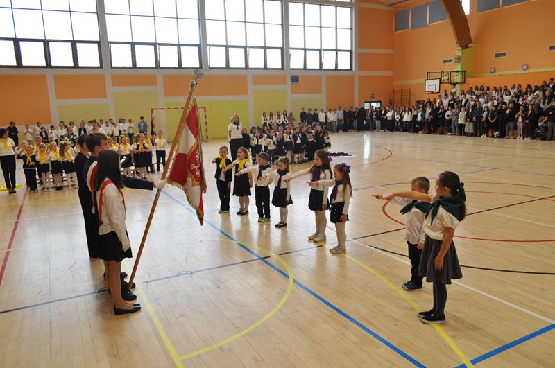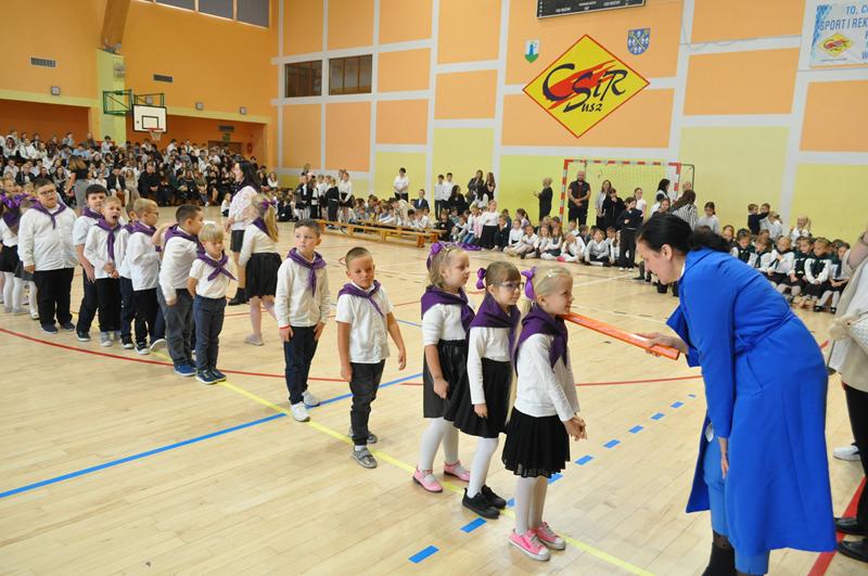 Na początku głos zabrała pani dyrektor Wioletta Ryszka, która przywitała zaproszonych gości, rodziców, dziadków i krewnych pierwszoklasistów oraz grono pedagogiczne, pracowników administracji i obsługi i społeczność uczniowską. Z jej ust popłynęły życzenia i podziękowania. Pani dyrektor wspomniała również o pięknym jubileuszu szkoły, jakim jest jej 80 lecie. Przedstawiła krótko genezę budowania wizerunku szkoły przez nauczycieli i pracowników oświaty w ciągu tych lat. Następnie nastał długo i z niecierpliwością oczekiwany moment ślubowania uczniów klas pierwszych.