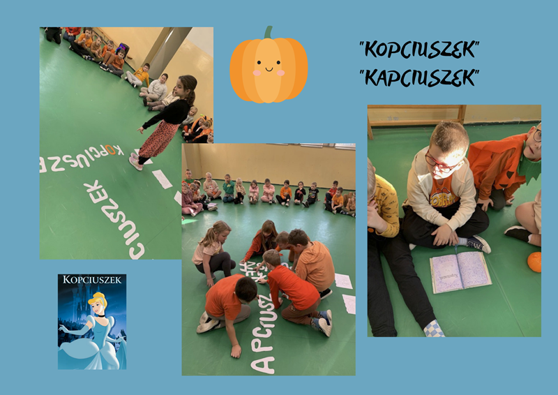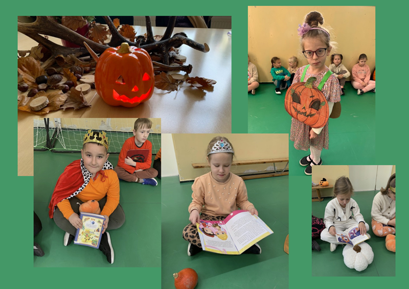 Dzieci przebrane w stosowne stroje poznali wartości tej rośliny oraz jej dekoracyjne walory. Rozmowy o dyni przeniosły nas do krainy zaczarowanych historii „Kopciuszka” i „Kapciuszka”. Pierwszy tytuł znany jest wszystkim od dzieciństwa. Każdy wie, że dobra wróżka zamieniła dynię w karocę. Książki to kopalnia wiedzy, północ na zegarze kojarzy się z magią. W rytm muzyki wskazywaliśmy godziny, opowiadaliśmy losy głównej bohaterki, wcielaliśmy się w role. Pantofelek pasował tylko na jedną stopę. Doskonale bawiliśmy się na balu, poznając starodawne tańce. Oprócz dyni pojawił się orzeszek, który nauczył wszystkich nowej wyliczanki. Czary mary i przenieśliśmy się do czasów współczesnych. Każdy był zadziwiony, że na półkach naszej szkolnej biblioteki są dawne historie w nowej odsłonie. Jedna zamiana literek o na a i z „Kopciuszka” staje się „Kapciuszek”. Zachęcamy wszystkich do przeczytania współczesnej odsłony tej książki. Treść jest równie pouczająca. Dzień Dyni minął szybko, wspomnienia pozostaną na długo, jak po przeczytaniu interesującej książki.