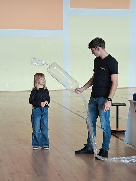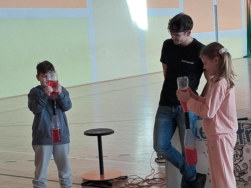 Uczniowie dowiedzieli się również, dlaczego piłka może unosić się w strumieniu powietrza z dmuchawy ? - Szybki strumień tworzy wokół niej obszary o różnym ciśnieniu, co sprawia, że piłka pozostaje w powietrzu zamiast spaść. Wyjaśnione zostało także, dlaczego planety położone dalej od Słońca poruszają się wolniej ? - Słońce słabiej je przyciąga, więc ich ruch po orbicie jest spokojniejszy i trwa dłużej. Ciekawym doświadczeniem były też połączone butelki, w których powstający wir pozwalał wodzie szybko przepływać z jednej do drugiej.