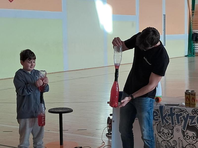 Pokazy dostarczyły wszystkim wiele emocji, ponieważ uczniowie nie tylko oglądali doświadczenia, ale także aktywnie brali w nich udział. Z entuzjazmem pomagali w przeprowadzeniu eksperymentów, próbując samodzielnie wyjaśnić obserwowane zjawiska. Dzisiejsze spotkanie z animatorem „ZAELEKTRYZOWANI” z pewnością zostanie zapamiętane na długo!