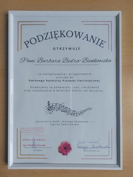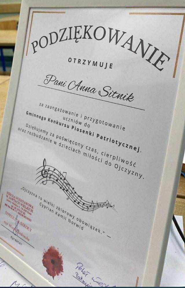 Składamy serdeczne podziękowania organizatorom Gminnego Konkursu Piosenki Patriotycznej ze Szkoły Podstawowej w Jawtach Wielkich za profesjonalne przygotowanie wydarzenia, życzliwą atmosferę oraz stworzenie uczniom przestrzeni do rozwijania talentów muzycznych.