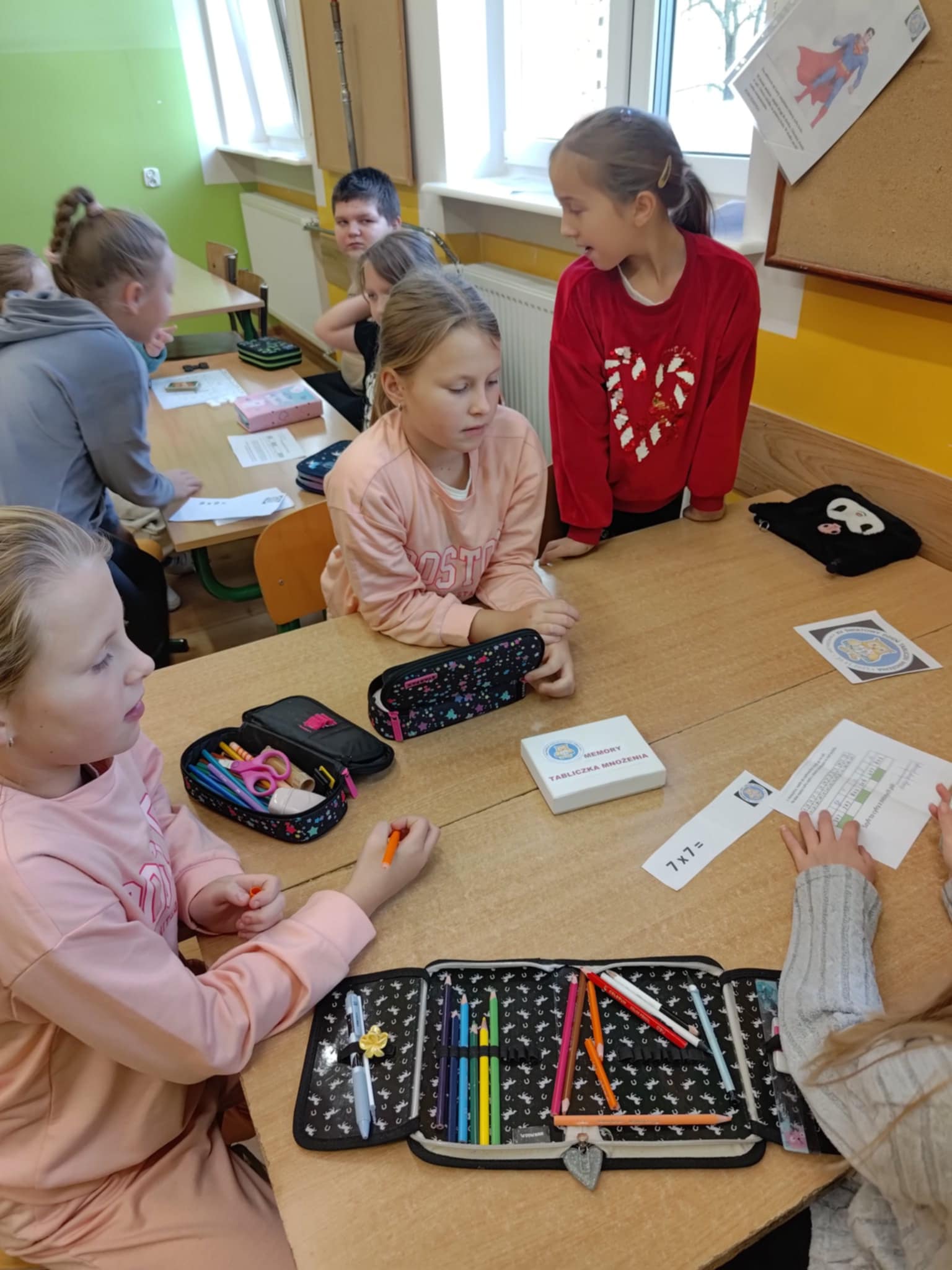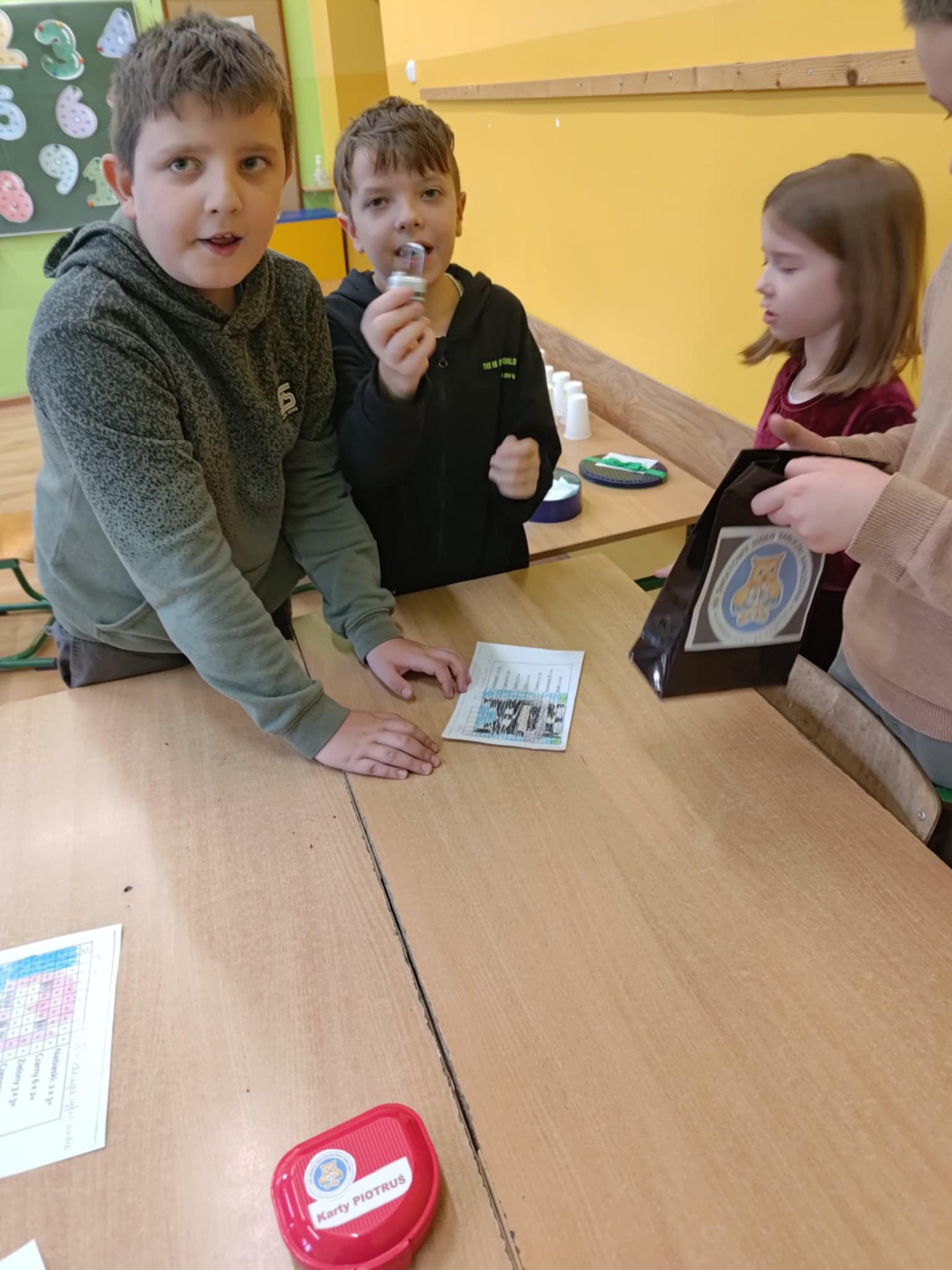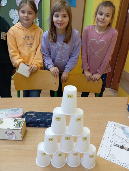 Na uczniów czekały między innymi: matematyczne domino, karty Piotruś, kółko i krzyżyk z działaniami oraz emocjonujący escape room, w którym każde poprawne rozwiązanie prowadziło do odkrycia kolejnych wskazówek. Nie zabrakło także „kubeczkowego zawrotu głowy”, kart pracy, matematycznego bingo, zabawy „wąż”," łap wynik", rozmowy liczb oraz dynamicznej sztafety mnożeniowej.