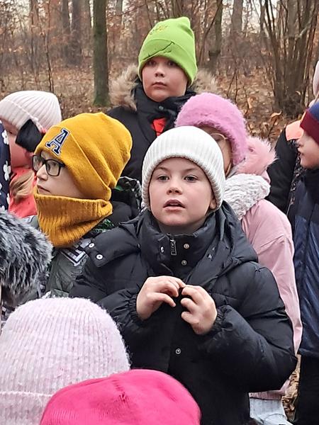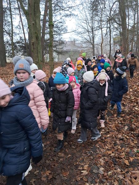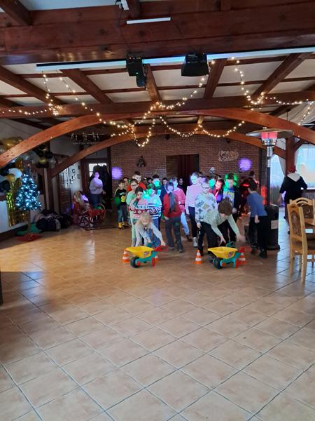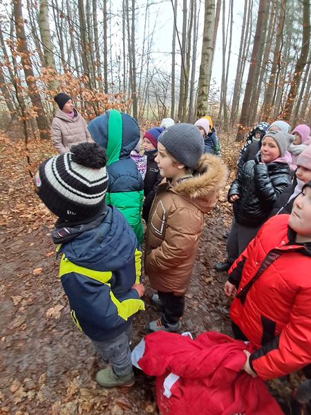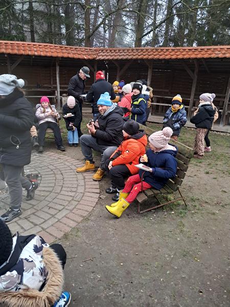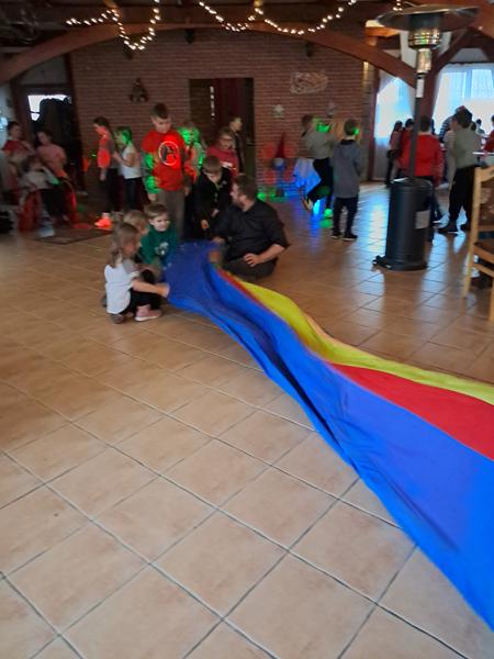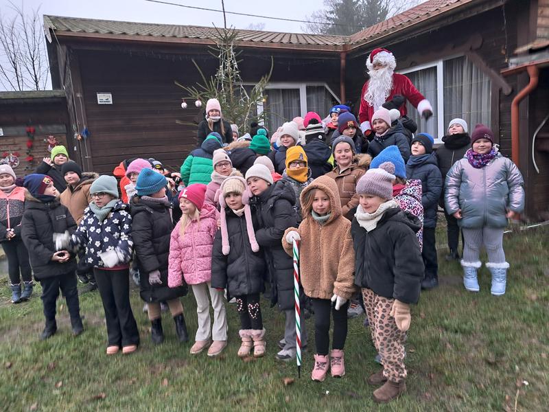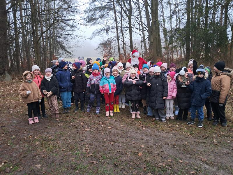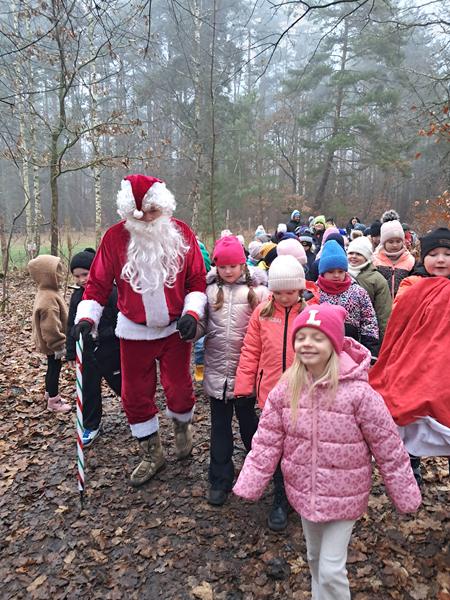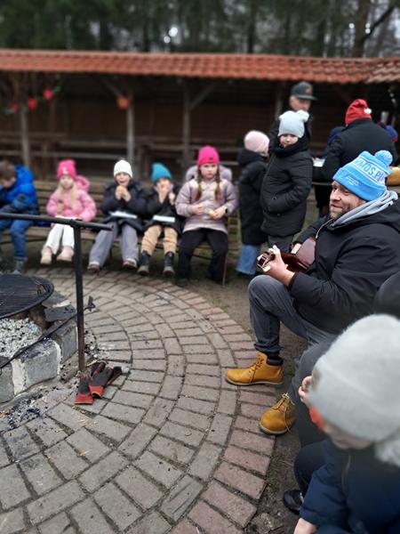 Zaliczenie zadania oznaczało, że zbliżamy się do spotkania z upragnionym gościem. Na początek przejście po linie, każda drużyna poradziła sobie doskonale. Wyścigi taczkami też nie sprawiły nikomu kłopotu. Rzuty do celu wywołały wiele pozytywnych emocji, jak i przejście tajnym tunelem. Zabawy z chustą animacyjną i rozgrywki kostką wszystkim się podobały. Nie zabrakło pieczenia świątecznych pierniczków. Po wykonaniu wszystkich zadań czekały na nas domowe słodkie rogaliki, pyszny sok i woda z cytryną. Po odpoczynku ruszyliśmy na poszukiwanie Świętego Mikołaja, droga prowadziła przez leśną ścieżkę. Dzięki podpowiedziom przewodnika udało nam się znaleźć Brodatego Gościa. Z piosenką na ustach wróciliśmy do miejsca, gdzie każdy mógł porozmawiać z Mikołajem. Oczywiście nie zabrakło prezentów i wspólnych zabaw. Nasz Gość pożegnał się z nami, ponieważ ma jeszcze wiele miejsc do odwiedzenia. Na nas czekały kolejne atrakcje na placu zabaw. Przy ognisku akompaniowała nam gitara, a pieczone kiełbaski smakowały wyśmienicie. Zabawy przy muzyce były miłym zakończeniem.