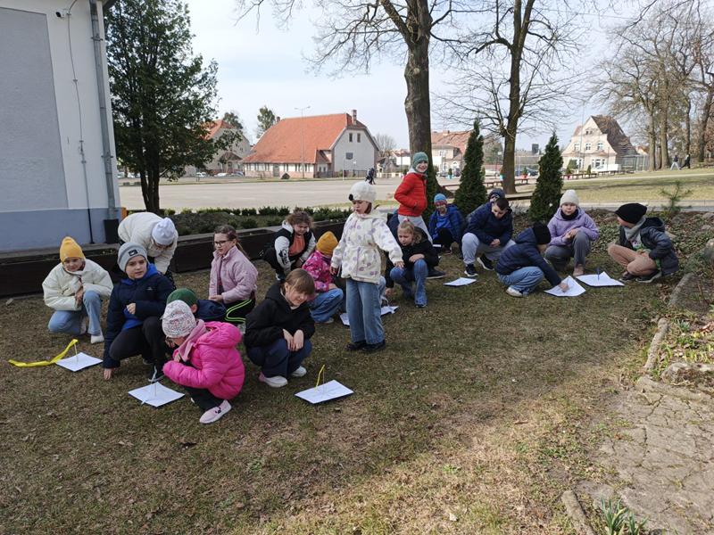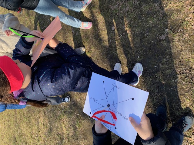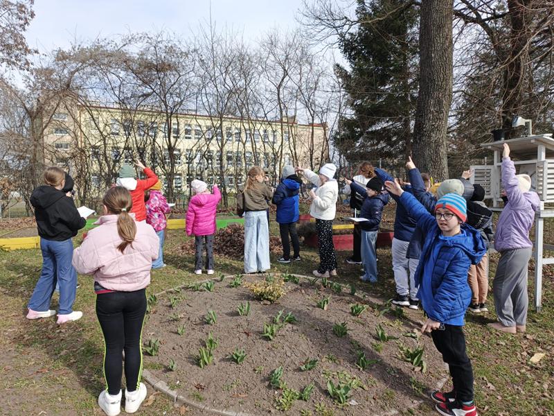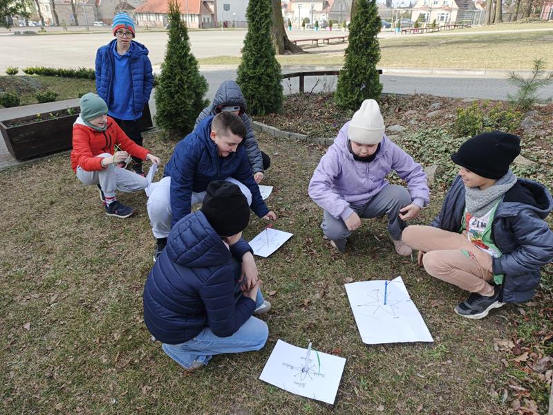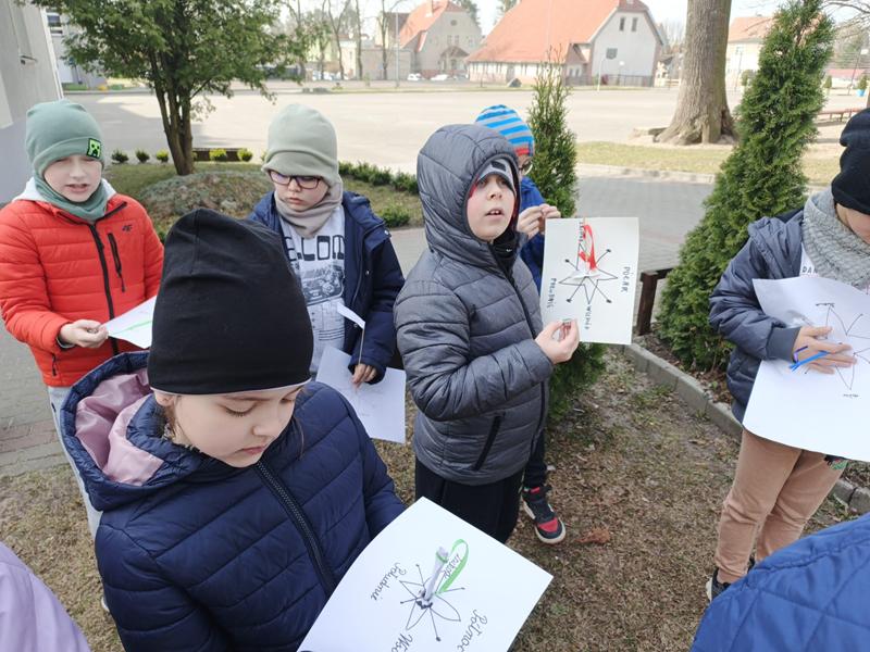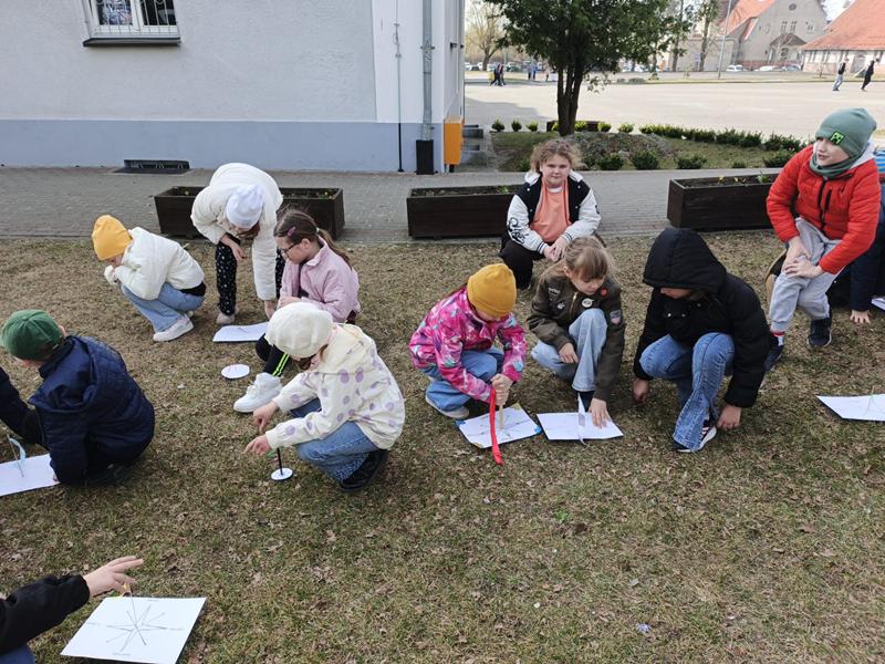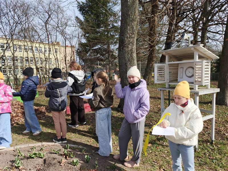 Dzieci uczyły się również korzystania z kompasu – poznawały jego budowę i zasady działania, a następnie wykorzystywały go do wyznaczania kierunku północnego. Ćwiczenia te pozwoliły im lepiej zrozumieć orientację w terenie oraz znaczenie kierunków świata w codziennym życiu. Zajęcia odbyły się w ogrodzie, gdzie uczniowie mieli możliwość obserwowania stacji badawczej wyposażonej w podstawowe przyrządy meteorologiczne, takie jak termometr, barometr oraz wiatromierz. Nauczyli się, do czego służą te urządzenia oraz jakie informacje można dzięki nim uzyskać. Dzięki tym działaniom uczniowie poznali na czym polega praca meteorologa – dowiedzieli się, jak prowadzi się obserwacje pogodowe, jakie pomiary są wykonywane oraz dlaczego są one ważne. Zajęcia miały charakter praktyczny i angażujący, co sprzyjało rozwijaniu ciekawości poznawczej oraz zainteresowania światem przyrody.